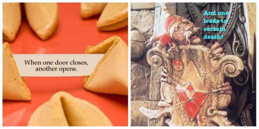 Since we’ve proven the connection between the words ‘piece of cake’ and the events which follow them, this leaves the rules of our puzzle – and the validity of the solution – totally intact. You see, while Sarah ignored the guards’ advice, (not to mention making a downward detour into the oubliette) she certainly didn’t die. Now how about that little slice? Let’s just hope if you were to get this fortune cookie the alternative wouldn’t be as deadly.