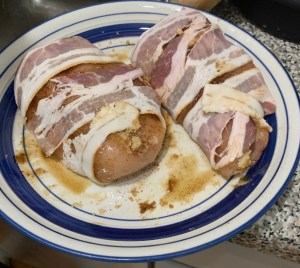 Once you have your chicken breasts seasoned, grab that bacon and start wrapping, Tom and I used two slices of bacon per chicken breast. If you’re a family of two; use four bacon slices if you’re a family of four; use eight slices of bacon. Or if it’s a bigger piece of chicken you can use three slices of bacon to ensure it is fully wrapped. As long and your chicken is fully wrapped in the bacon it will be fine, use your discretion. Now this last part is very important, once you have your chicken wrapped you may liberally add more brown sugar to coat the bacon on the top of your chicken breasts.