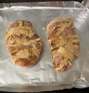 Take your two chicken breasts and liberally saturate them in Worcestershire sauce so that they are completely covered. Next, you’re going to generously sprinkle some garlic powder and chili powder. We honestly don’t measure so use your best judgement on how much or how little seasoning you feel comfortable with. Finally, generously coat the chicken with brown sugar and make sure to rub in-don’t be shy-show that dinner some love!